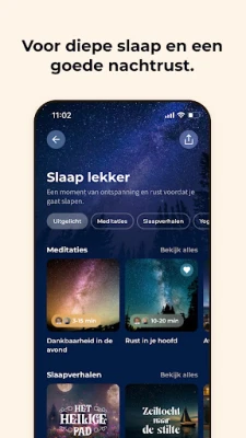 Duik in een rijke verzameling van honderden meditaties, zorgvuldig ontworpen voor elk moment: van een kalme start van je dag tot een vredige nachtrust met speciale slaapsessies. Verrijk je innerlijke wereld met ademhalingsoefeningen, krachtige affirmaties en visualisaties die dankbaarheid en zelfvertrouwen aanwakkeren. Laat je meevoeren door onze unieke muziekcollectie, met klanken variërend van stimulerende focusbeats tot ontspannende piano en therapeutische binaural beats, ideaal voor concentratie, diepe ontspanning of een herstellende slaap. Ervaar de transformerende kracht van yoga nidra en body scans voor ultieme diepe rust, en verdiep je persoonlijke groei met inspirerende luisterboeken van Michael Pilarczyk. Zelfs de allerkleinsten vinden rust en emotionele ondersteuning met speciale kindermeditaties, kinderyoga en slaapliedjes.