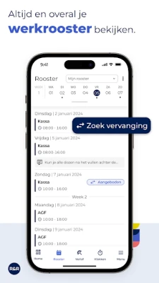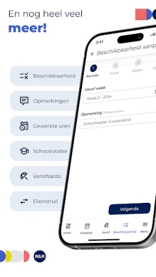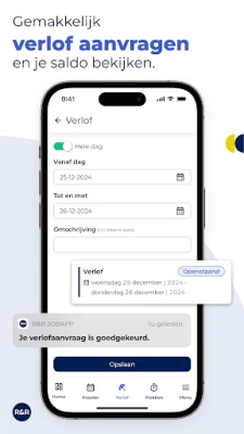 Met de R&R Job App heb je een schat aan functionaliteiten binnen handbereik. Bekijk moeiteloos je meest actuele persoonlijke rooster en krijg gedetailleerd inzicht in je gewerkte uren. Het aanvragen van verlof wordt een fluitje van een cent, terwijl je tegelijkertijd je actuele verlofsaldo kunt raadplegen. Wil je diensten ruilen met een collega? Dat regel je eenvoudig via de app, waarna je leidinggevende de aanvraag kan goedkeuren. Geef je beschikbaarheid door en integreer zelfs je schoolrooster, zodat je planning altijd optimaal afgestemd is op jouw leven. Bovendien ontvang je directe notificaties bij elke roosterwijziging, zodat je altijd volledig op de hoogte bent.
