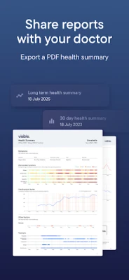 Verkrijg dagelijks een helder beeld van je welzijn door eenvoudig je telefooncamera te gebruiken. Visible meet essentiële biometrische gegevens, waaronder hartslagvariabiliteit (HRV) en rusthartslag, om je 's ochtends vroeg al inzicht te geven in je stabiliteit. Daarnaast stelt Visible je in staat om dagelijks symptomen, medicatie en inspanningen nauwkeurig te registreren. Deze uitgebreide gegevensverzameling onthult cruciale patronen in je aandoening, waardoor je beter kunt begrijpen welke levensstijlfactoren een positieve of negatieve invloed hebben op jouw gezondheid.