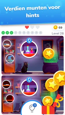 Laat je meevoeren door een gigantische bibliotheek vol verbluffende foto's, variërend van adembenemende landschappen en schattige dieren tot levendige stadsgezichten en intrigerende alledaagse objecten. Elk level in Verschillen is zorgvuldig ontworpen om je geheugen en oog voor detail te testen, waarbij je tegen de klok racet om alle verborgen verschillen te vinden. Easybrain heeft tevens dagelijkse uitdagingen en speciale seizoensevenementen geïntegreerd, waarmee je unieke trofeeën en exclusieve ansichtkaarten kunt verzamelen. Mocht je even vastlopen, dan zijn er altijd hints beschikbaar, en met de intuïtieve zoomfunctie ontsnapt geen enkel detail aan je aandacht.
